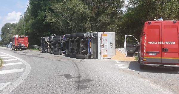 Ferite lievi per il conducente di un camion che, intorno alle 13 di oggi, giovedì, si è ribaltato, finendo appoggiato su un fianco, sullo svincolo che da Portacomaro Stazione porta alla quattro corsie della statale Asti-Alba. Il mezzo, che viaggiava appunto in direzione Alba, si è rovesciato a bordo strada, perdendo il carico di grano che stava trasportando. Nell’incidente ha abbattuto un palo dell’illuminazione pubblica ed ha urtato il guardrail. Sul posto sono intervenuti l’ambulanza del 118, i vigili del fuoco e una pattuglia della polizia municipale.