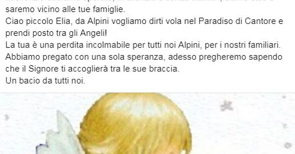 Elia non ce l'ha fatta. Il cuore del bimbo di 3 anni rimasto gravemente ferito nell'incidente d'auto avvenuto in frazione Castiglione, ad Asti, a fine luglio, ha cessato di battere questa sera. Per tutti questi giorni il piccolo ha lottato per la vita, ma troppo gravi sono state le lesioni riportate e neppure i medici dell'ospedale di Alessandria hanno potuto salvarlo. Dolore infinito per il padre, la madre che era alla guida dell'auto e che nella stessa notte dell'incidente ha dato alla luce il fratellino di Elia, con un parto d'urgenza. Distrutti i nonni Franco e Italia gestori del Circolo della Casa Alpina. Proprio le Penne Nere di Asti, sulla loro pagina Facebook hanno annunciato che «c'è un angelo speciale che veglierà su tutti gli Alpini».