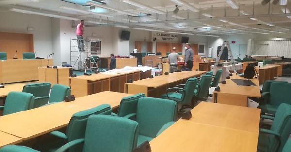 Lavori consistiti nella rimozione della parete mobile che divide le due aule più grandi di Palazzo di Giustizia, la 5 e la 6, quest’ultima dotata della cella a sbarre e dell’impianto di videoconferenza con i carceri.