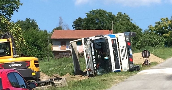 Incidente oggi pomeriggio in Strada Lis nella frazione Bardella di Castelnuovo Don Bosco. Un camion utilizzato per il trasporto terra su un cantiere per lavori stradali si è ribaltato su un fianco lungo la ripida discesa che conduce alla strada per Castelnuovo, all'incrocio con il ristorante Fonte Solforosa.