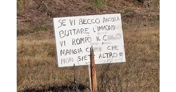 All'Asp sono state fatte più segnalazioni della discarica abusiva e nel giro di poche ore è stata bonificata. Ma è comparso il cartello molto arrabbiato del proprietario che recita "Se vi becco ancora a buttare l'immondizia, vi rompo il c....., mangia c..... che non siete altro".
