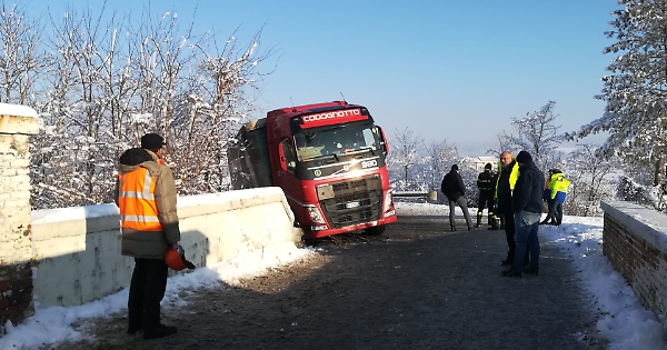 Gravi disagi questa mattina per i pendolari che prendono il treno verso Torino a causa della fuoriuscita di strada di un camion e rimorchio sul cavalcavia della ferrovia a Baldichieri, poco dopo la stazione. L'incidente è accaduto intorno alle 8 a causa del fondo stradale completamente innevato e ghiacciato. Il grosso mezzo, nell'affrontare l'ultimo tratto in salita prima di imboccare lo stretto passaggio del ponte, è scivolato di lato e si è "appoggiato" al guard rail mentre il carico del rimorchio si è spostato verso la riva che porta ai binari.
