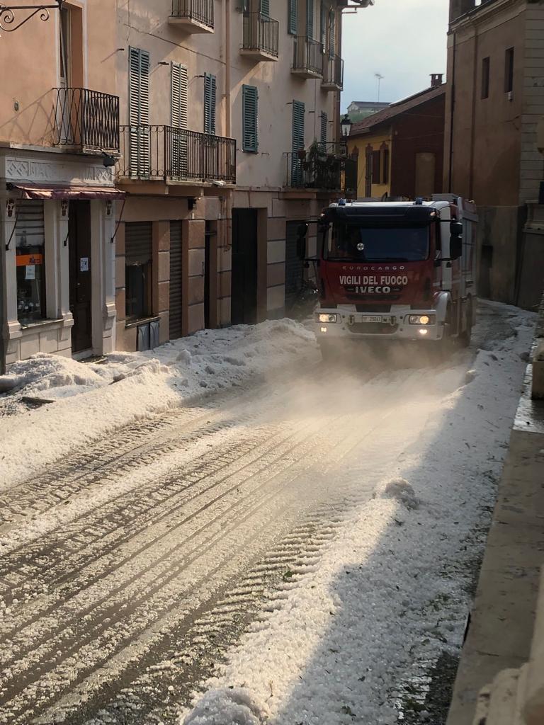 Ma è in centro a Castelnuovo Don Bosco che si è verificato uno spettacolo innaturale per essere alla vigilia di Ferragosto: tutta la grandine portata giù dall'acqua dalla sommità del borgo antico si è concentrata nel tratto di via Guglielmo Marconi che va dalla tabaccheria al colorificio, formando una coltre molto alta e spessa che solo con il lavoro di una ruspa è stato possibile spostare e smassare.