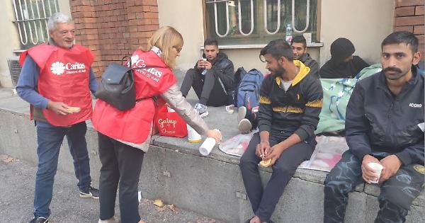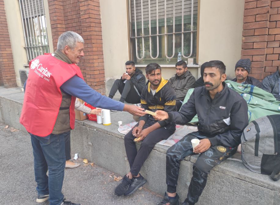 Anche questa mattina, come succede da qualche giorno, alcuni volontari della Caritas si sono presentati intorno alle 8 per rifocillare il gruppo di profughi, tutti pakistani, che hanno dormito nei sacchi a pelo sotto le finestre della Questura di Asti. Brioches, caffè e thè caldo per offrire un po' di conforto dopo una notte passata all'aperto che, se pure non ancora con i rigori invernali, mette comunque a dura prova la resistenza dei giovani migranti in attesa di poter accedere in qualche modo al riconoscimento di rifugiati. Gli stessi volontari ogni mattina ricordano ai profughi che possono accedere ai locali del loro centro diurno per senzatetto, il Samaritano, per un riparo e per potersi lavare.