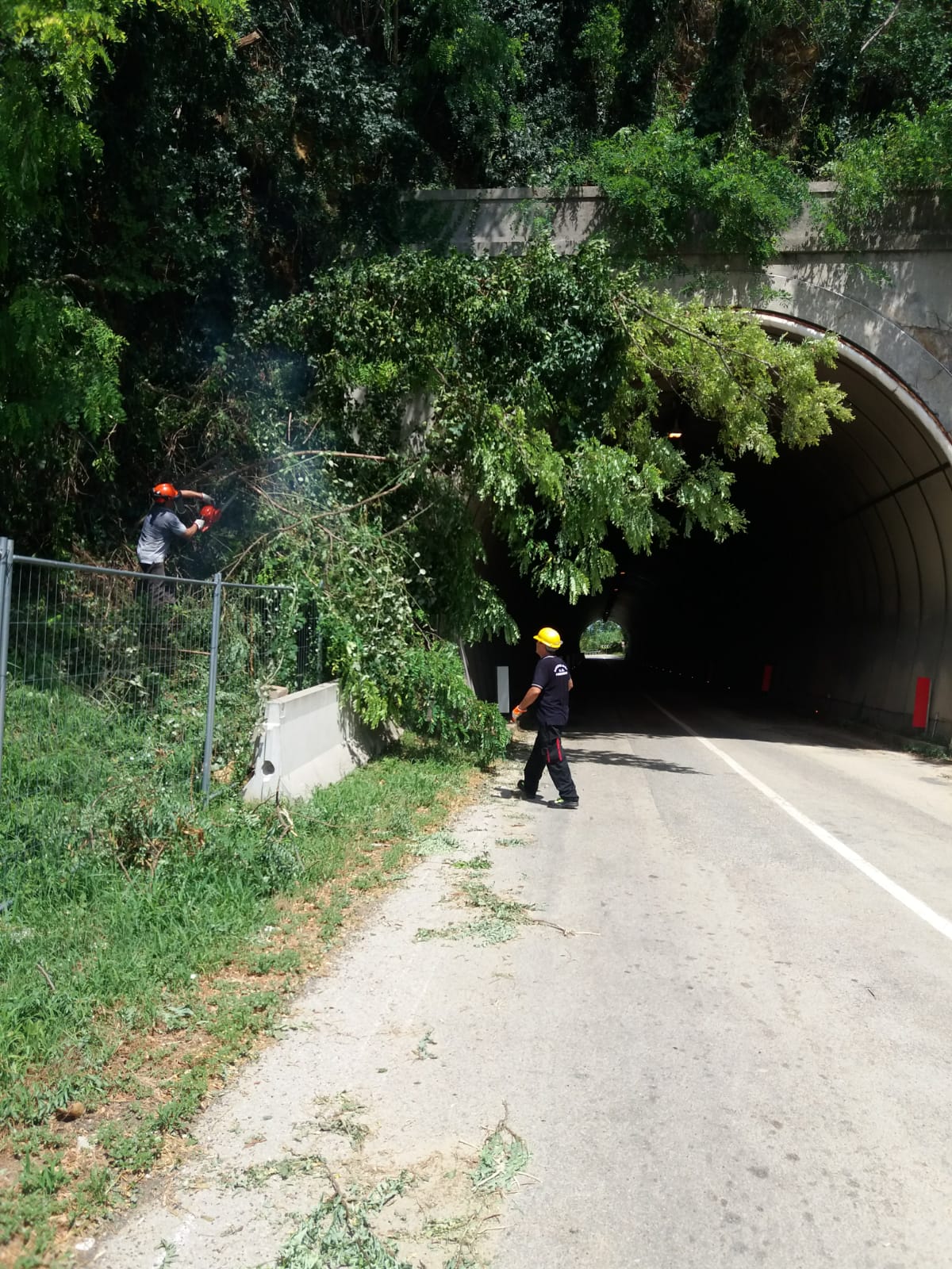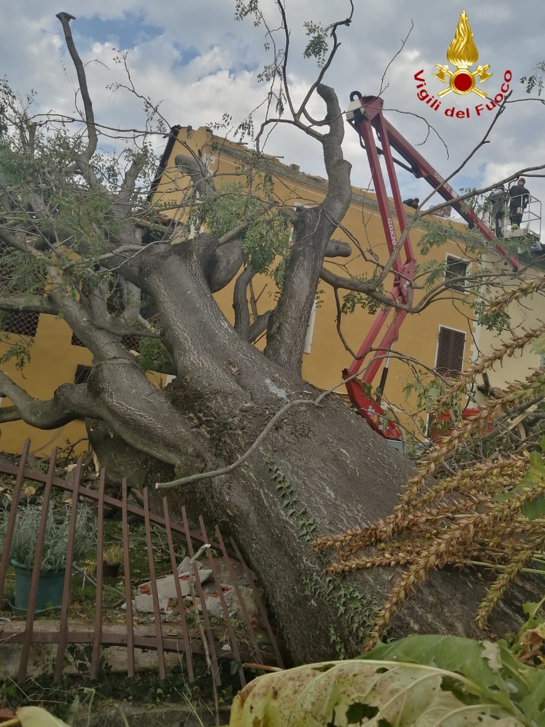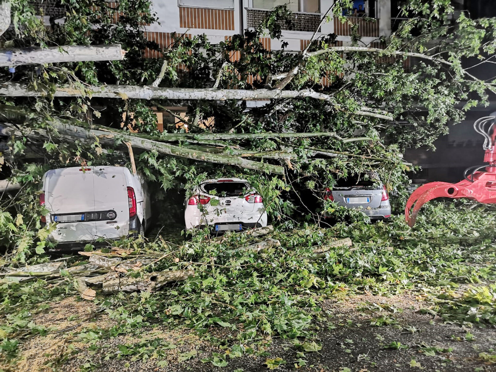 In città l’intervento più importante è stato quello in via Fratelli Rosselli per il secolare platano che è crollato sulle auto in sosta (un furgone e sei autovetture) tutte completamente schiacciate dal fusto.