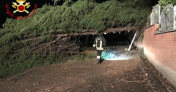 I Vigili del Fuoco hanno provveduto a tagliare i tronchi e ad ammucchiarli sui lati della strada per riaprire il traffico ai mezzi.