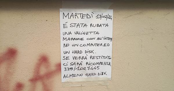 Il volantino è scritto a mano, con un pennarello su un foglio A4 da fotocopiatrice, appeso in via Cotti Ceres.