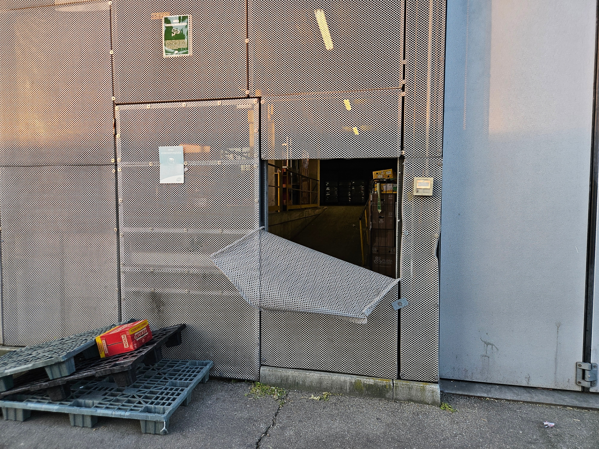 Il pannello di metallo che è stato piegato per aprire un varco verso i magazzini del Pam [foto J.R.]