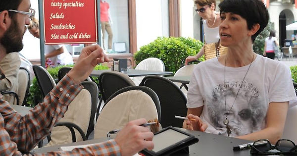 Le campane della Collegiata rintoccano mezzogiorno mentre con Andrea Mirò ?- arrivata apposta da Milano dove ormai vive stabilmente -? prendiamo posto nel dehor del bar "Lo Stregatto", su