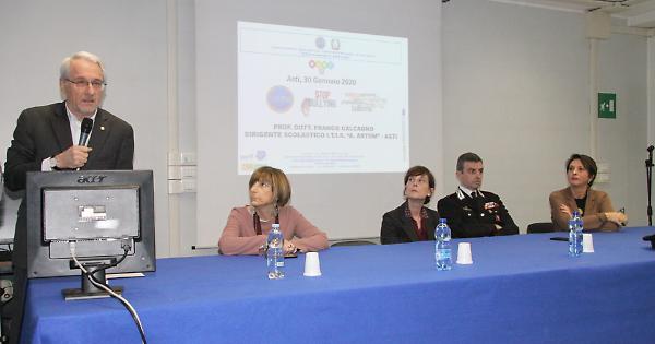 Ad intervenire, oltre al dirigente scolastico Franco Calcagno, Stella Perrone, dirigente scolastico dell’istituto Alfieri; Vittoria Rissone, vicario della Questura di Asti; Elena Ferrara, consulente dell’Ufficio scolastico regionale, già senatrice, promotrice e prima firmataria della Legge 71 del 2017 ed ex insegnante di Carolina Picchio, la ragazzina quattordicenne di Novara, vittima di cyberbullismo suicidatasi nel 2013 e ispiratrice della legge.