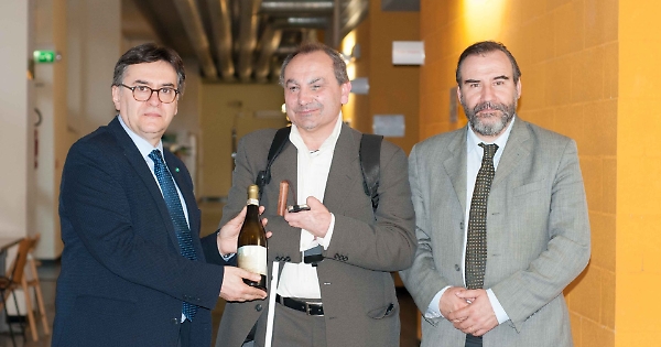 Come esempio di autentica fruizione, è stata presentata una bottiglia di vino con etichetta in braille e QR code in grado di fornire indicazioni e informazioni sulla cantina e sul luogo di provenienza del prodotto che Adriano Capitolo ha voluto donare (nella foto), a fine convegno, a Roberto Cerrato presidente dell’Associazione per il Patrimonio dei Paesaggi Vitivinicoli.