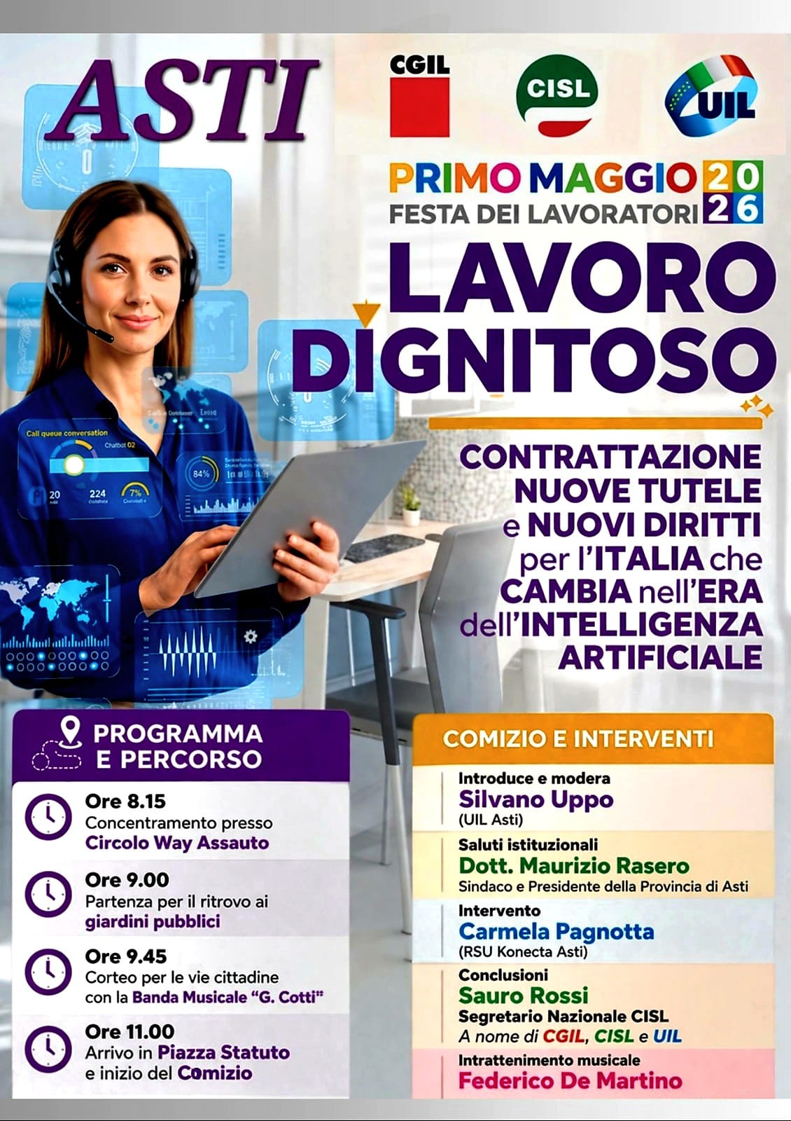 All’insegna dello slogan “Lavoro dignitoso - Contrattazione, nuove tutele e nuovi diritti per l’Italia che cambia nell’era dell’intelligenza artificiale”, il corteo vedrà il concentramento dalle 8.15 al circolo Way Assauto, per poi partire alle 9 alla volta dei giardini pubblici, da dove si muoverà alle 9.45, preceduto dalla banda cittadina G. Cotti. Percorrerà viale alla Vittoria, piazza Primo Maggio, corso Alfieri, via Gobetti e piazza San Secondo, con tappa finale in piazza Statuto alle 11. Sul palco interverranno il sindaco Maurizio Rasero per i saluti istituzionali, quindi Carmela Pagnotta (Rsu Konecta Asti), che parlerà della crisi del settore dei call center con riferimento alle vertenze locali. Le conclusioni saranno affidate a Sauro Rossi, componente della segreteria nazionale Cisl, a nome dei tre sindacati. Al termine dei comizi, intrattenimento musicale a cura di Federico De Martino.