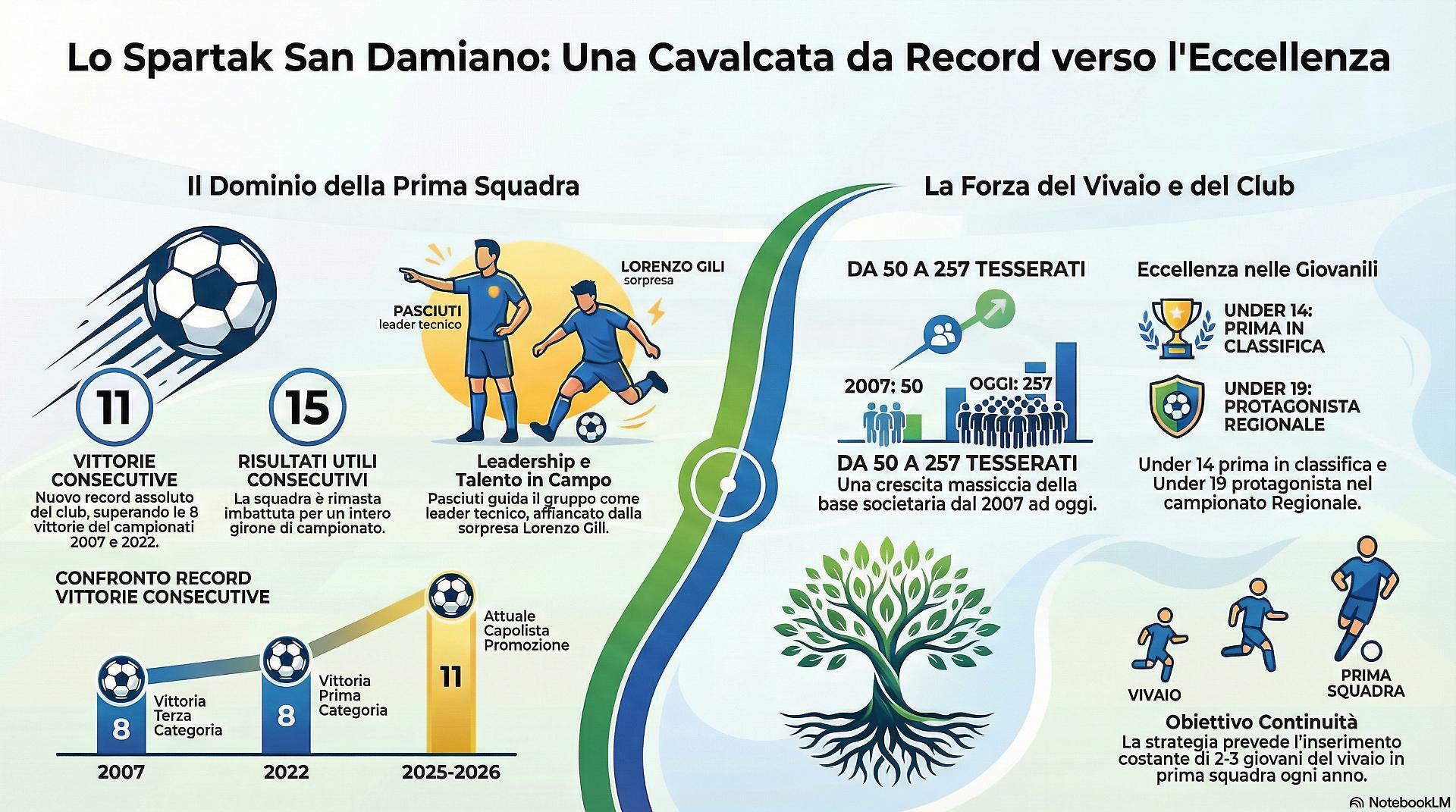 Un'isola felice, che, dall'alto della vetta nel campionato di Promozione, sogna un traguardo storico. In casa Spartak San Damiano, club calcistico che sta conducendo le danze nel proprio girone di Promozione, l'Eccellenza non è utopia ma un target a portata di mano. Il presidente Francesco Anastasio e il direttore sportivo Totto Ballario discutono della straordinaria serie di undici vittorie consecutive, un record societario che ha proiettato la squadra verso il sogno dell'ambito traguardo. Oltre ai successi della prima squadra, viene sottolineata l'importanza di un settore giovanile in forte crescita, fondamentale per alimentare il progetto tecnico con nuovi talenti locali.