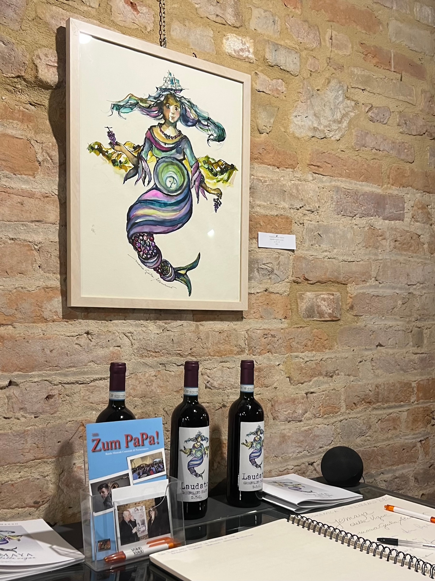 “Yemaya delle vigne”, una sirena delle vigne avvolta nei colori dell’uva, è insieme “un’opera, un’etichetta, il titolo di una mostra”. In occasione dell’esposizione è stato infatti presentato anche il nuovo volto del Grignolino “Laudato”, prodotto dalla “Vigna del Papa” di Portacomaro.