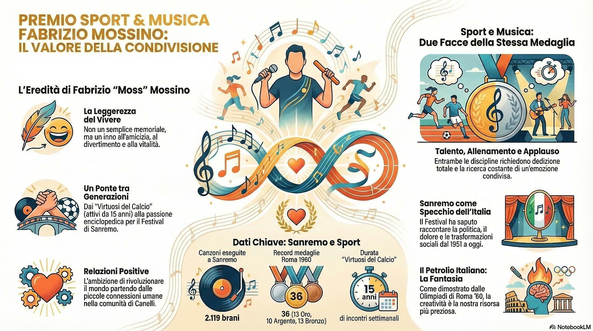 Hanno infinite continuità: entrambi partono da un talento di base, che sia correre o comporre, e richiedono allenamento e applicazione. Entrambi, poi, inseguono la stessa cosa: un applauso, un successo, una vittoria. Un Festival di Sanremo non è poi così diverso da uno scudetto. Personalmente, ho fatto dello sport la mia professione per oltre 50 anni, ma la musica è la passione che mi permette di specchiarmi nell'Italia del dopoguerra.