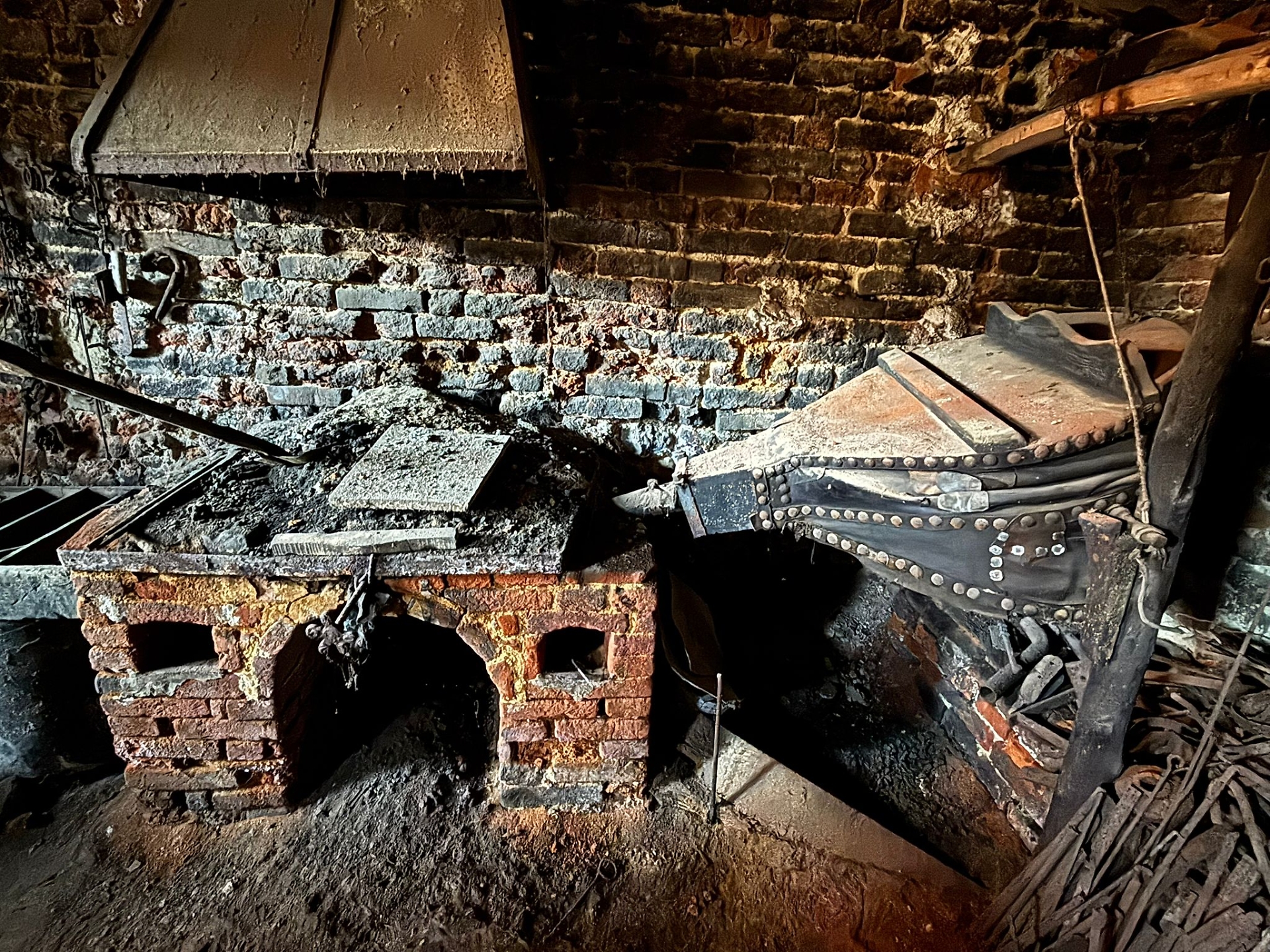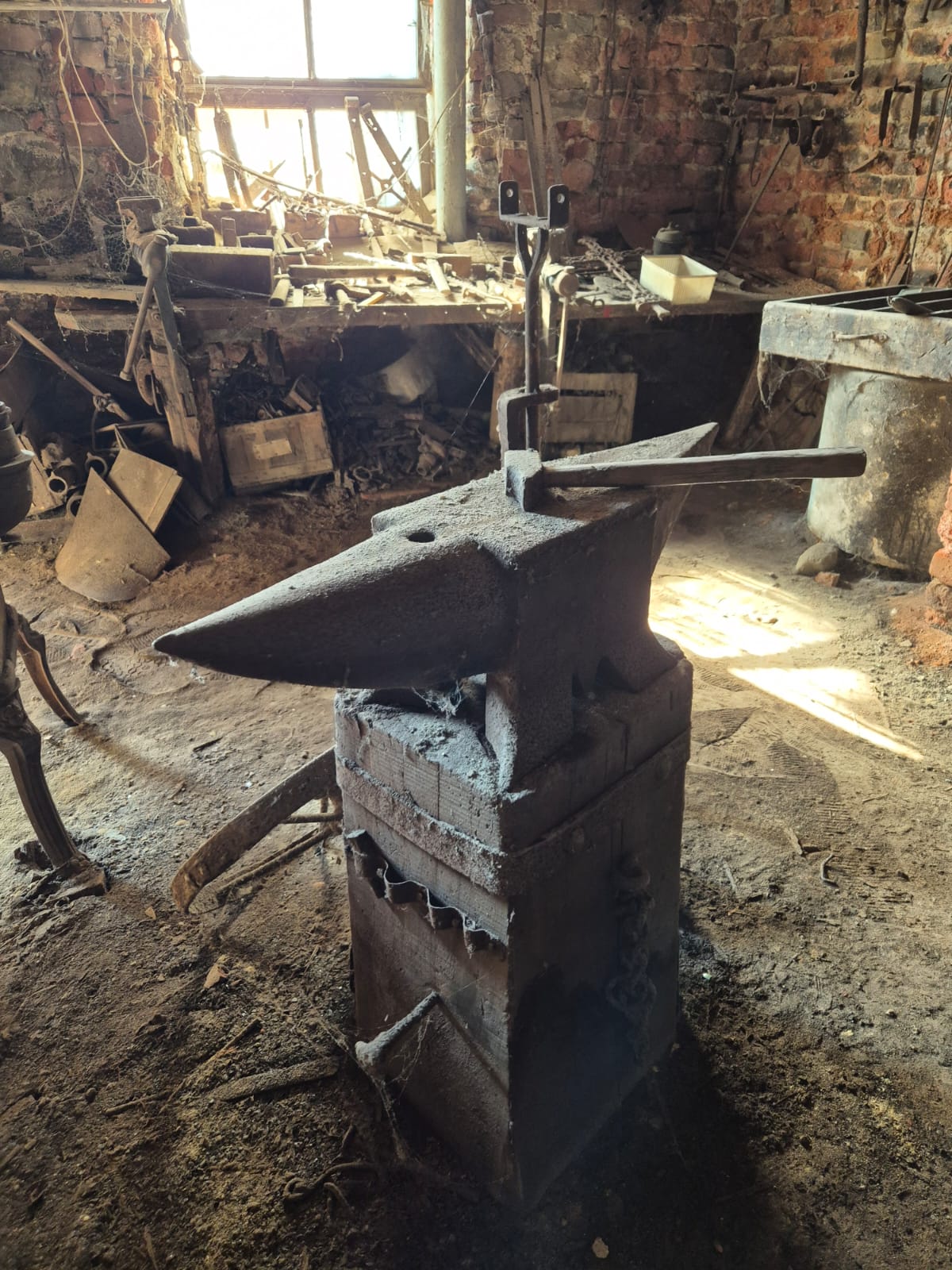 Una stanza congelata nel tempo dove l’unica concessione alla modernità è un piccolo motore elettrico, accroccato dal vecchio fabbro, per far girare la mola. Il grande incudine campeggia al centro del piccolo locale con soffitto in mattoni a vista anneriti dal fumo che usciva dalla forgia con tiraggio incanalato direttamente in una canna fumaria nel muro. Il grande mantice azionato a pedali per soffiare sulle braci in modo da far raggiungere la temperatura giusta al ferro che Secund spostava sul vicino incudine per battere e modellare. Il tornio verticale, monumentale, per arrotondare le barre di ferro e creare opere d’arte per ringhiere, letti, grate, cancelli. Sul bancone e appesi al muro con ganci ci sono tutti gli arnesi che gli servivano e, contro le pareti, le barre di ferro da cui partiva per i suoi lavori. Insieme ad una decina di vecchie macchine per dare lo zolfo nelle vigne che, essendo in rame, servivano da “ricambio” dal quale tagliare il pezzo che serviva.