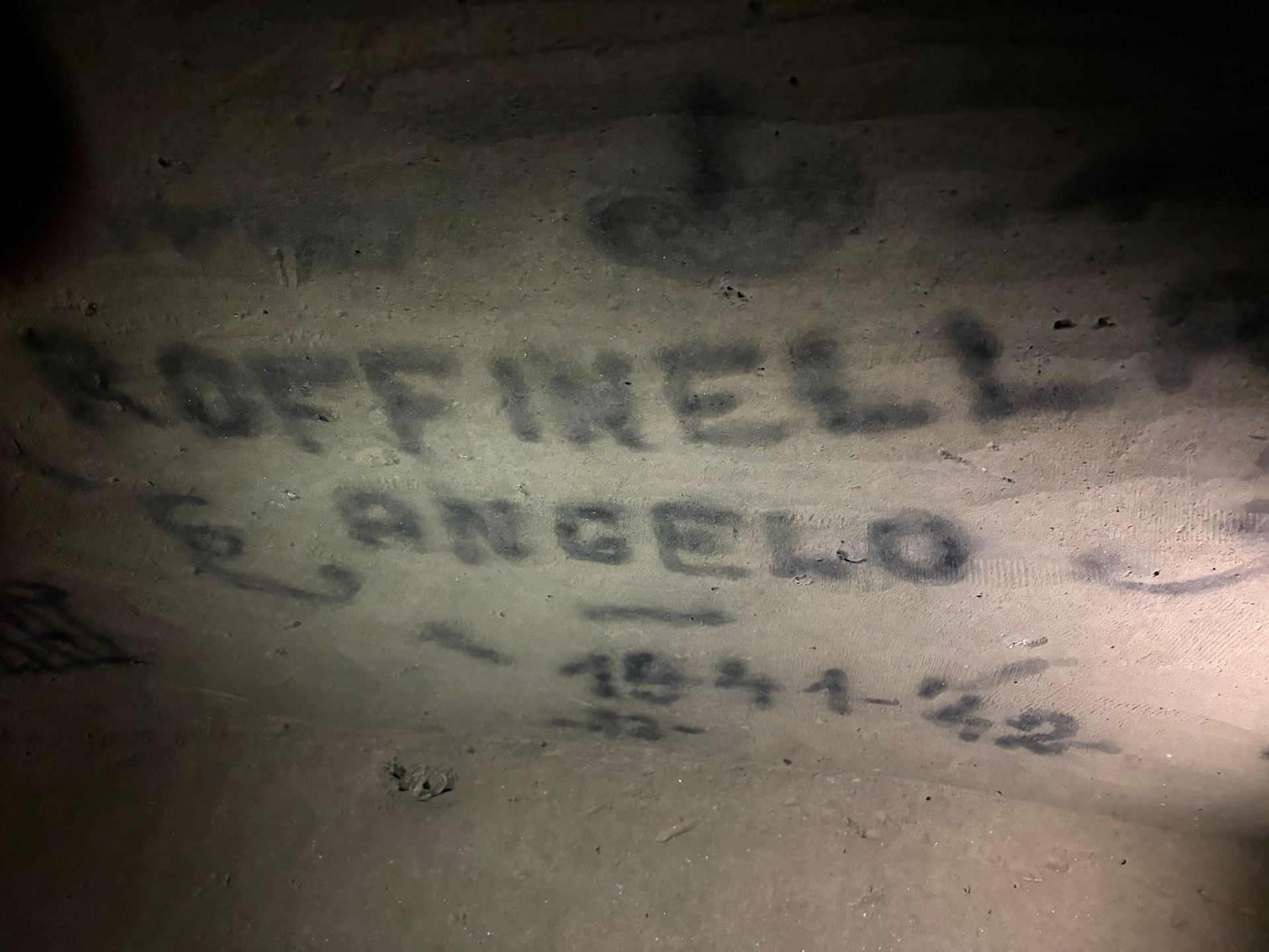 Ma la bottega non è l’unica chicca di quella casa. Proprio vicino alla mola c’è una botola che conduce ad un “infernot” originale, cantina scavata nel tufo a metri di profondità organizzata in più locali collegati da scale che corrono sotto strade e case del paese. Tutto frutto di lavoro di scavo nella terra dura come il cemento. Ci sono ancora i segni delle bottiglie di vino appoggiate sulla sabbia astiana e, sui soffitti, le scritte con il fumo delle candele. Da quella di Angelo Roffinella, figlio di Second, a quelle di Carlo, Pinotu, Gino e tante altre. Con date che vanno dal 1941 al 1944.