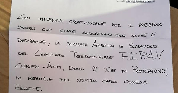 “Spesso siamo abituati ad applaudire i nostri atleti e talvolta a fischiare i nostri preziosi arbitri.” - scrive Paolo Bertone, presidente del Comitato Fipav Cuneo-Asti, alle società affiliate - “Penso che in questa situazione tutti i tesserati del nostro territorio si possano accomunare in un grande applauso ai nostri arbitri: hanno veramente vinto una gara molto importante, in ricordo del caro e non dimenticato amico Ermete.” Alessandro Ponzo, responsabile degli arbitri, ha personalmente consegnato il materiale, ringraziando tutti gli arbitri del Comitato che hanno contribuito e tutti gli esercizi commerciali che hanno favorito il reperimento delle tute (chi con sconti e chi cercando eventuali scorte in magazzino). “Tutti i presidi ospedalieri e le sezioni della Croce Rossa stanno cercando materiale di protezione.” - commenta Ponzo - “Se anche voi volete fare qualcosa, cercate nelle ferramenta della vostra zona se qualcosa è rimasto, acquistatelo e donatelo, anche solo pochi pezzi.”