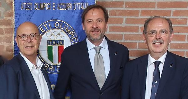 Nella foto: Giorgio Gianuzzi (il primo a destra) con Gianfranco Imerito presidente astigiano dell’Associazione Nazionale Atleti Olimpici e Azzurri d’Italia e Stefano Mei, Presidente della Federazione Italiana di Atletica Leggera.