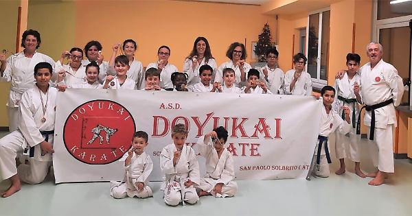 Domenica 19 dicembre presso il palazzetto dello sport " LA CASA DEL PELLEGRINO " di Villanova d'Asti si è svolta la 4a edizione della " COPPA DI NATALE " di karate specilità KATA organizzato dalla F.I.K. (Federazione Italiana Karate ) con una cornice di pubblico numerosa e con circa 120 atleti con una stramaggioranza di bambini a partire dai 5 anni proveniti da tutto il Piemonte. La palestra "DOYUKAI" del Maestro AUGUSTO CALO' di San Paolo Solbrito si è presentato con 27 allievi vincendo tantissime medaglie, in particolar modo dai 2 katarateki più piccoli PERETTI JULIAN, medaglia d'oro, e MANCUSO GABRIELE, medaglia d'argent,o di soli 5 anni seguiti poi da bambini cintura bianca 6/8 anni maschile BOULENOUAR MOHAMED, ROLETTO DIEGO E MORHAT AMINE, tutti al 2° posto. Nelle stessa categoria cintura bianca ma femminile KONE SARAH 2° posto MILETTO SOFIA MARI ELISA e HUSANU SOFIA 3° posto.Nella cat. ragazzi 9/11 anni la medaglia d'argento è andata a EL OMARI MAHDI cintura blu, mentre alle cintura bianche il secondo posto è andato a BOULENOUAR RAYAN e a ACCARDO TOMMASO il terzo posto sempre cint. bianca DEMASI STEFANO. Nella cat. femminile medaglia d'oro a AVELLINO LAURA cint. arancione secondo posto a ZAIA ELEONORA cint. arancione, cint. gialla terzo posto per MARI SOFIA, cintura bianca medaglia di bronzo a RAHBIB HIND e EL BOUKRI WISSAL.Cat. 12/13 maschile medaglia d'oro a ASSANDRI MATTEO cint. blu secondo posto DEMARIA FABIO cint. verde e terzo posto per la cintura bianca BOULENOUAR ABDERRAHMAN, Cat. 14/15 maschile cint.blu medaglia d'oro a EL OMARI SALAH, Cat. femminile 16/17 cintura verde DEMARIA REBECCA medaglia d'oro.Per la cat. amatori medaglia d'oro a ROSSI GIANCARLA cint. marrone. Cint. arancione a ROSAS SONIA e per la cintuar bianca a MARECO STEFANIA MEDAGLIA, medaglia d'argento a STERLACCI FRANCESCA.