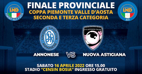 Sabato 16 Aprile 2022 al “Censin Bosia” di Asti si disputerà la Finale Provinciale di Coppa Piemonte Valle d’Aosta – Seconda e Terza Categoria di Asti. Dopo due anni di stop a causa della pandemia, si ritornerà a disputare il big match tra le due squadre astigiane, di Seconda e Terza Categoria, per contendersi il titolo provinciale. Per la prima volta ci sarà una compagine di Terza Categoria, ovvero l' ANNONESE a sfidare una squadre di Seconda Categoria, la NUOVA ASTIGIANA CALCIO. Il fischio d’inizio sarà alle ore 15.00. La finale sarà in gara unica in campo neutro, che come da consuetudine è lo Stadio "Censin Bosia" di Asti, che ha fatto da cornice anche alle precedenti edizioni. La squadra vincente al termine della sfida andrà a rappresentare la provincia di Asti alle finali regionali.