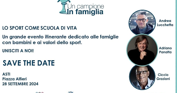 Sabato 28 settembre, a partire dalle 9 sino alle 12, si terrà in piazza Alfieri la manifestazione “Un campione in famiglia”, un grande evento itinerante dedicato alle famiglie ed organizzato da Cattolica Assicurazioni, con il patrocinio del Coni e del Comitato italiano Paraolimpico. Saranno presenti tre campioni di diverse discipline, ossia il tennista Adriano Panatta, il calciatore Ciccio Graziani ed il pallavolista Andrea Lucchetta.