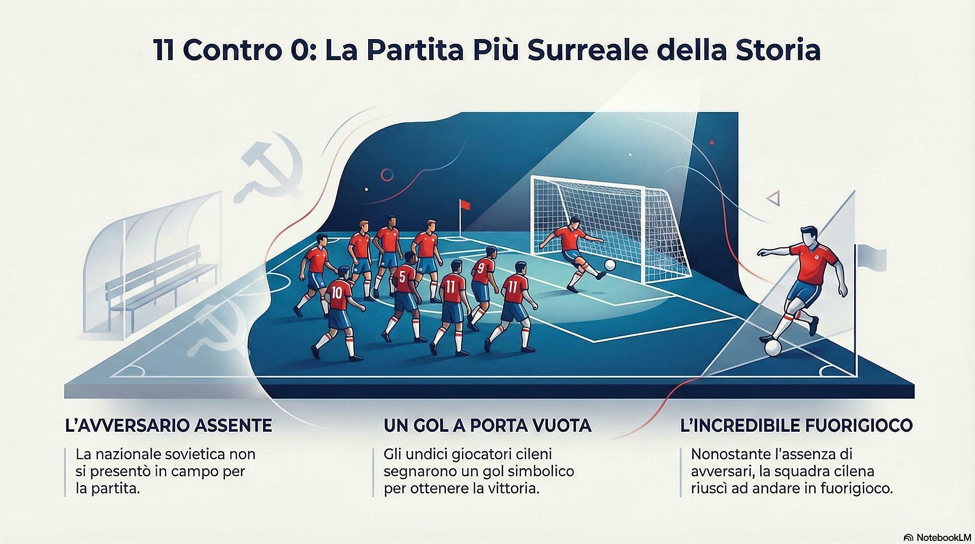 La partita di calcio che non è mai esistita, ovvero la sfida del 1973 tra Cile e Unione Sovietica. A causa del rifiuto sovietico di scendere in campo per motivi politici, i calciatori cileni disputarono una partita fantasma senza alcun avversario.