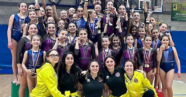 Amerio Ludovica oro corpo libero e trave e argento mini trampolino, Fiora Aurora oro parallele, argento trave e mini trampolino, Musso Laura bronzo corpo libero, Rivata Kendra bronzo volteggio, Sardi Ella bronzo parallele.