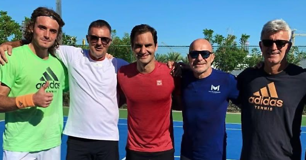 Davide Giusti, in bianco, assieme a Tsitsipas e "King" Roger Federer
