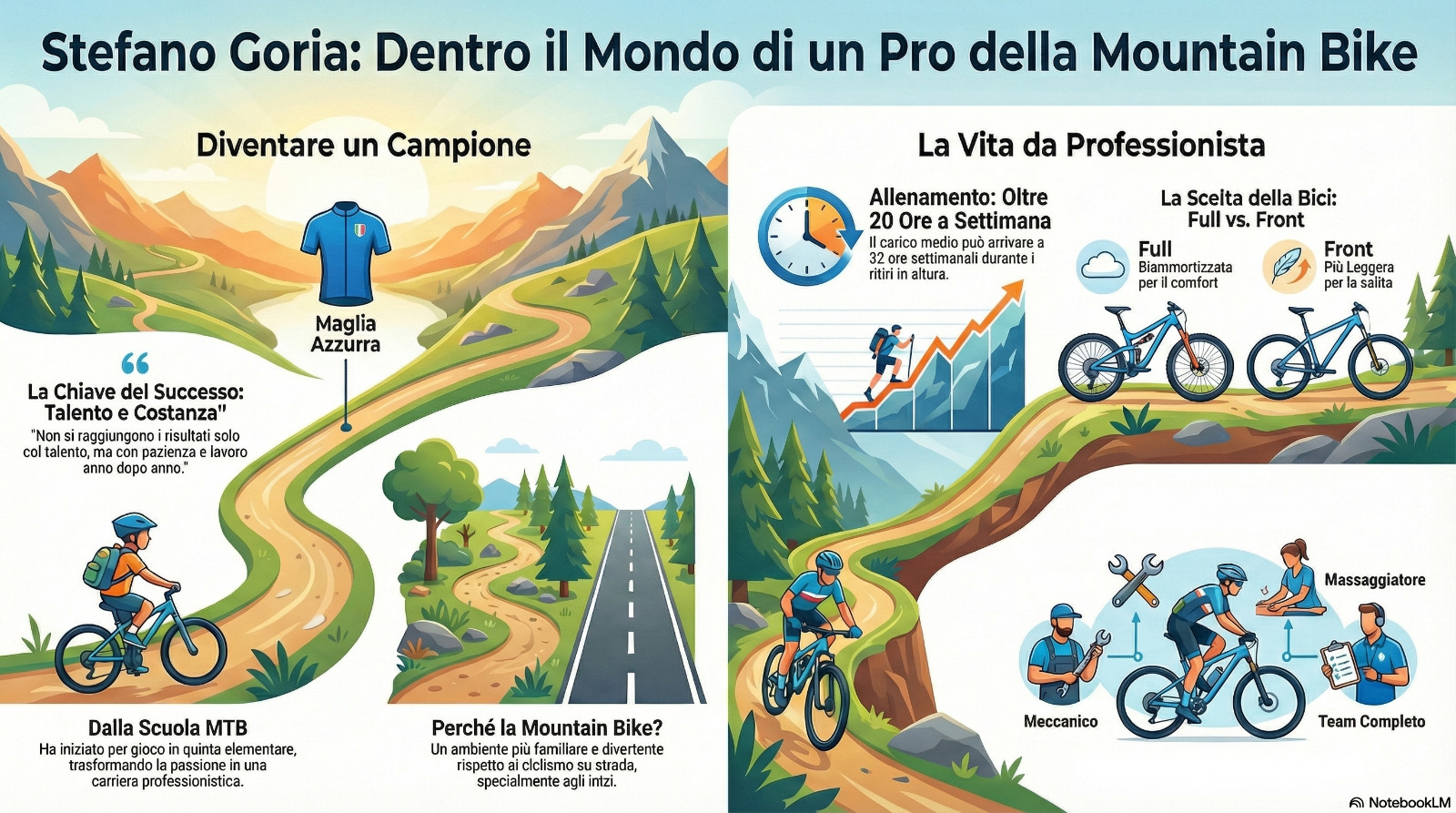 Prima andavo alle gare e i miei genitori mi aiutavano con le borracce; ora ho un team manager, un meccanico, un massaggiatore, un nutrizionista e vari coach. La mia settimana tipo prevede tra le 20 e le 32 ore di allenamento effettivo, alternando palestra, bici da strada e mountain bike. È un lavoro di costanza: i risultati non arrivano solo col talento, ma "martellando" giorno dopo giorno.
