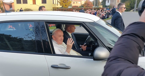 Ad attenderlo in strada anche il cugino Franco Travo che si è avvicinato alla Fiat 500 bianca di Bergoglio chiedendogli se potesse aiutarlo a scendere, ma il Papa, ringraziandolo, non ha avuto bisogno di aiuto.